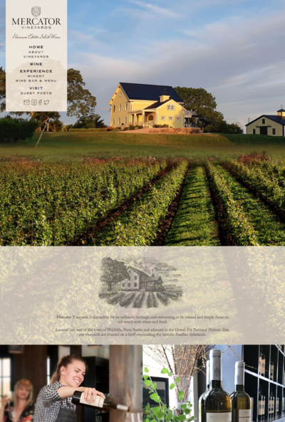The genesis of the Mercator Vineyards brand is rooted in a winery distinctive for the estate’s 200-year-old farm lands, its authentic heritage and in its simple focus on old-world style wine. The vineyards are situated on a high bluff overlooking the historic Acadian dykelands on the Bay of Fundy. The winery experience is welcoming and relaxed in a lovingly restored space that showcases extraordinary wines and deliciously paired culinary offerings. The tradition of the lands original hard working European settlers’ rustic and hearty food and drink continues here today.